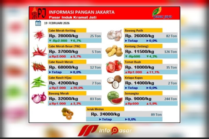 Jakarta, infopasar.id – Berdasarkan data terbaru dari Informasi Pangan Jakarta pada Kamis (19/2/2026), pergerakan harga sejumlah komoditas sayur mayur di Pasar Induk Kramat Jati terpantau bervariasi.