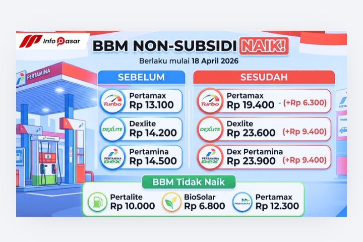 Jakarta, infopasar.id – PT Pertamina (Persero) secara resmi melakukan penyesuaian harga bahan bakar minyak (BBM) nonsubsidi yang mulai berlaku efektif pada Sabtu, 18 April 2026.